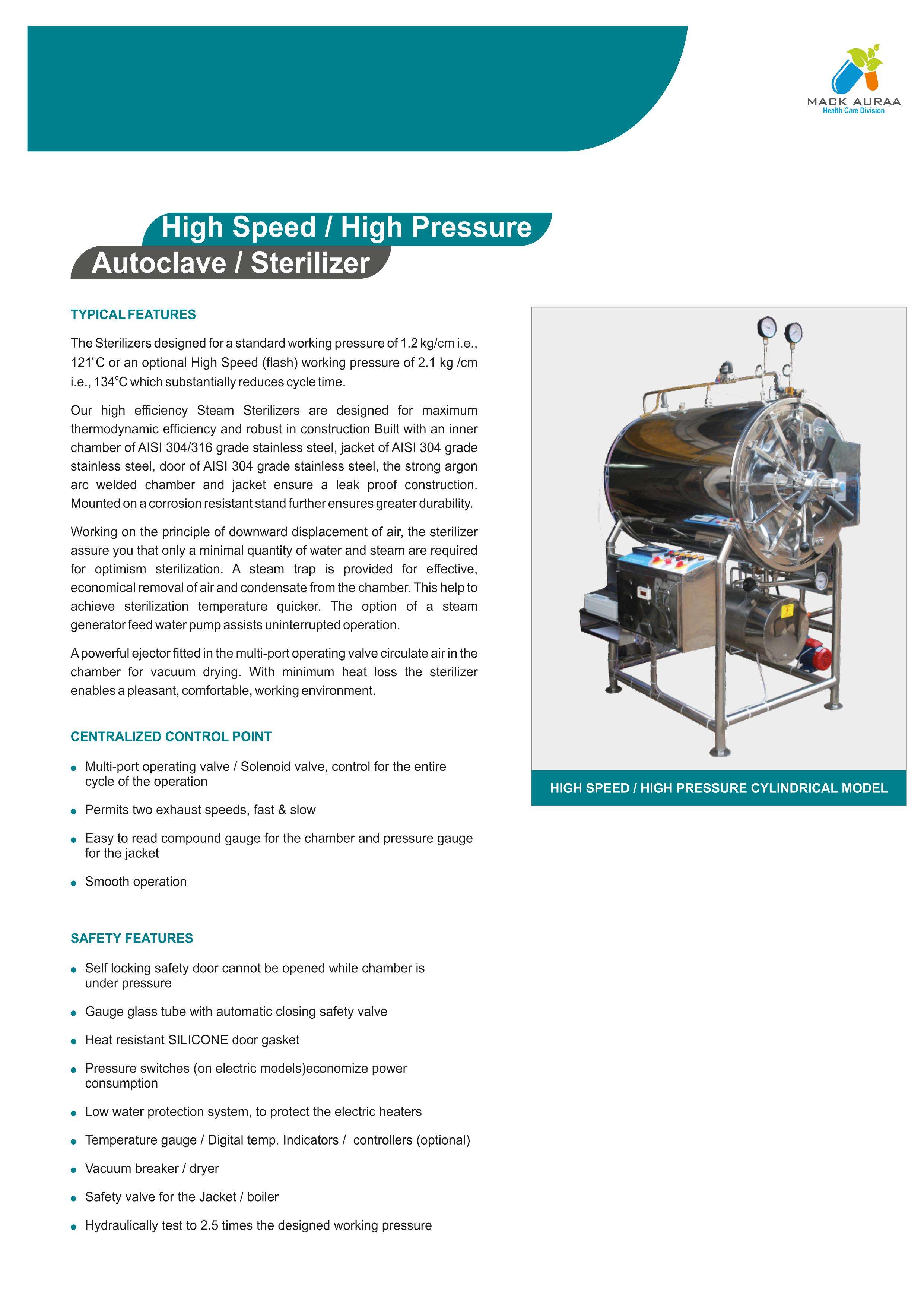The High Pressure Steam Sterilizer is specially designed for sterilization of porous load fabrics, wrapped instrument, tray sets, dressing, surgical instruments, etc. in a pharmaceutical and hospital facility.