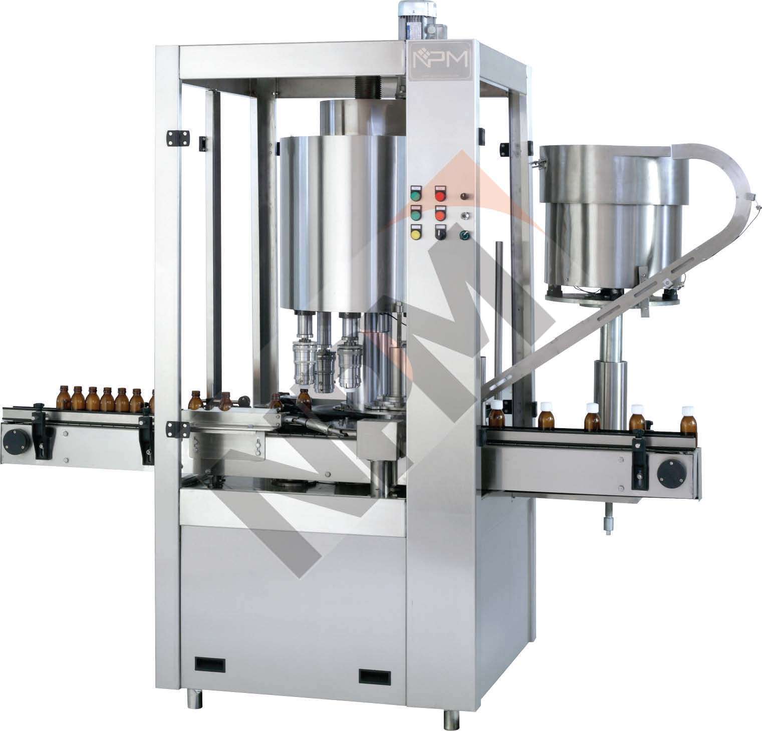 NPM's Automatic Capping Machine is resourceful and self-sufficient on stainless steel legs that have a height adjustable system. The product is made on sturdy welded MS frame that closes entirely in stainless steel and doors that ensure the operation of the mechanism.