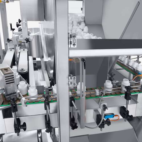 The CVC 1263D Monoblock Bottle Unscrambler & Air Rinser is designed to automatically feed bottles from a bin, place them upright onto conveyor, convey to air rising station and then 180-degree inversion at speeds of up to 120 bottles per minute. The CVC 1263D is built on a Siemens control system including a HMI panel. Options include ionized air rinse with vacuum, fallen bottle sensor with return to bin, low level hopper sensor, tower lamp, Static eliminator bar and customized bottle format change parts. STANDARD FEATURES • Monoblock design with unscerambling and air rinsing saves space • Low level hopper sensor • Bottle backlog sensor at outfeed • Interlocked safety guarding • Type 304 stainless steel bin, frame, enclosure panels. • Type 316 stainless steel contact parts. • ISO 9001 certified. AVAILABLE OPTIONS: • Static Electricity Eliminator • Vacuum block detection assembly • Upside down bottle, fallen bottle reject assembly • Tower lamp • 21CFR Part 11 License