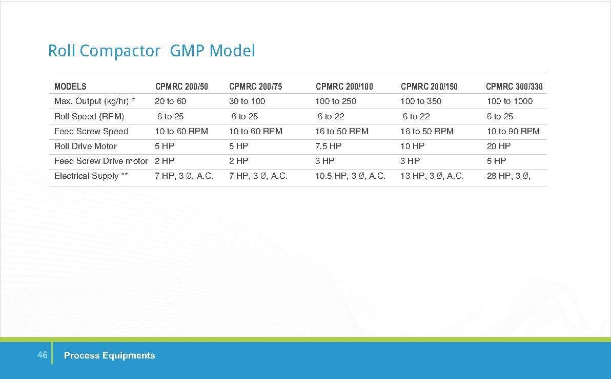 • In compliance with cGMP guidelines • Contact parts are made of S.S. 316 except rollers • All covers are designed to obtain dust-free operation • Feed screw is steplessly driven through variable frequency drive • Hard chrome planted & mirror finished compacting rolls made of tools steel • Pre-compaction chamber guides the product to rolls without any slippage or leakage • Electrical interlocking between main roll drive and feed screw drive